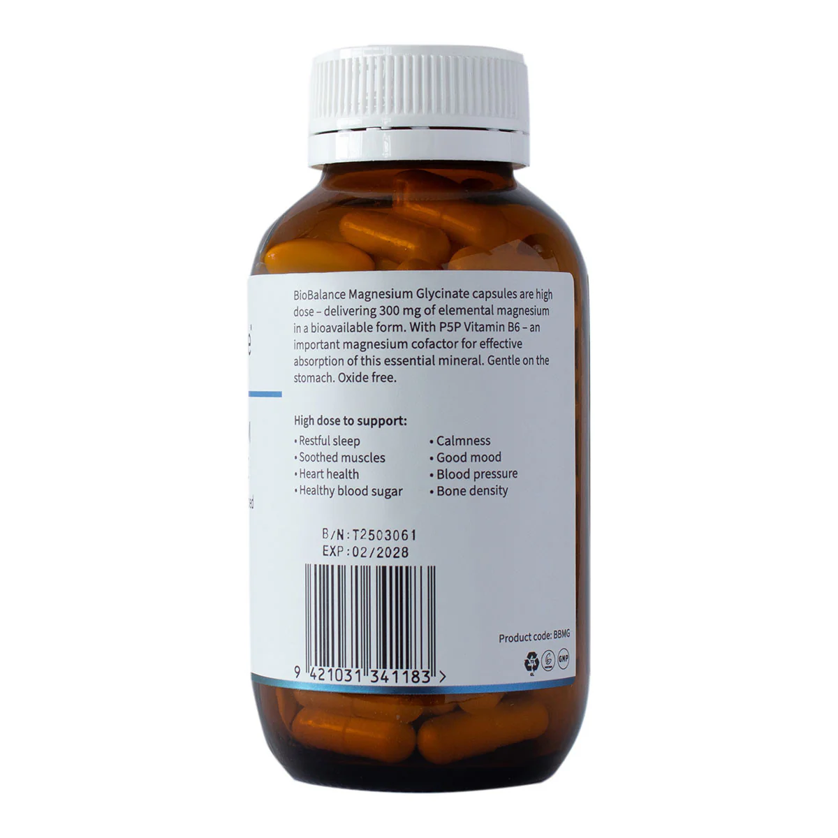 BioBalance Magnesium Glycinate - High Dose delivers a high-strength 300mg dose of elemental magnesium in one of the most bioavailable forms – magnesium glycinate – enhanced with P5P (active B6) for optimal absorption. This highly absorbable formula supports restful sleep, calm mood, relaxed muscles, and heart health. In a one-a-day capsule. Easy on the stomach. Oxide free.